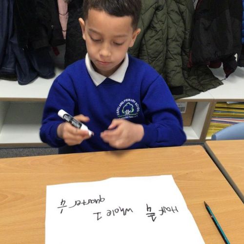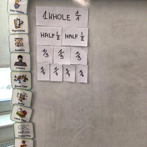 We are learning about fractions. We used terms ‘numerator’ and ‘denominator’ to describe the parts of fractions, and strips and cubes to represent different fractions.
