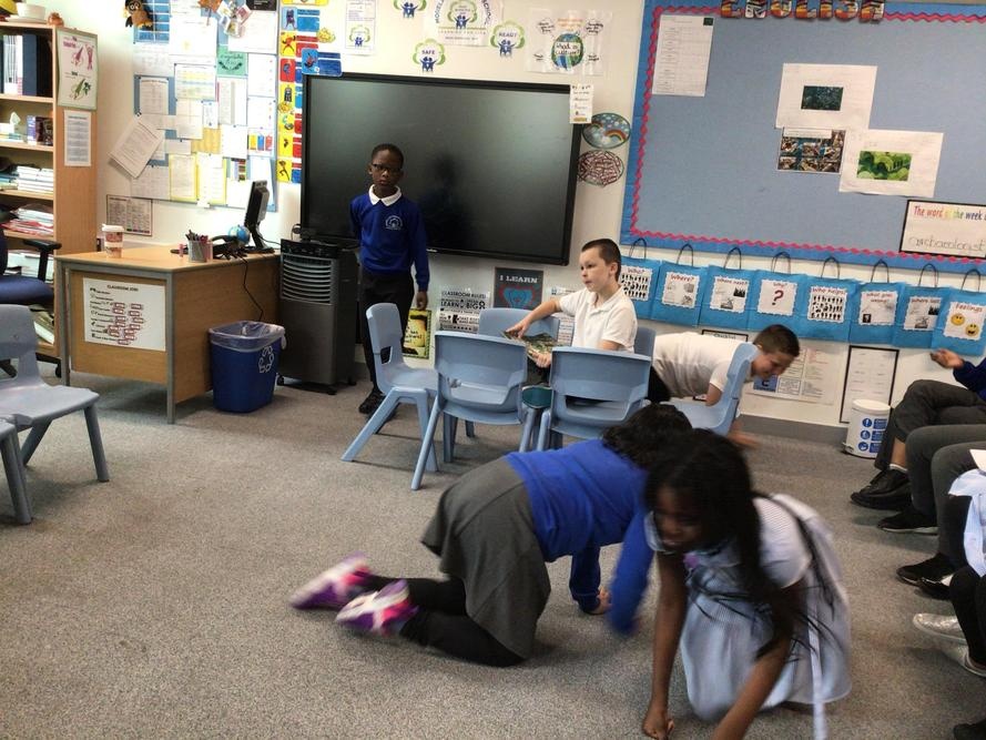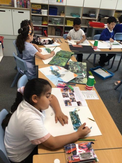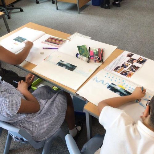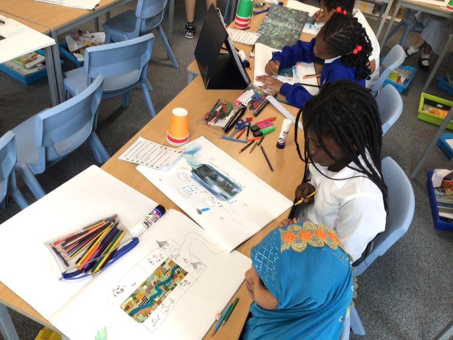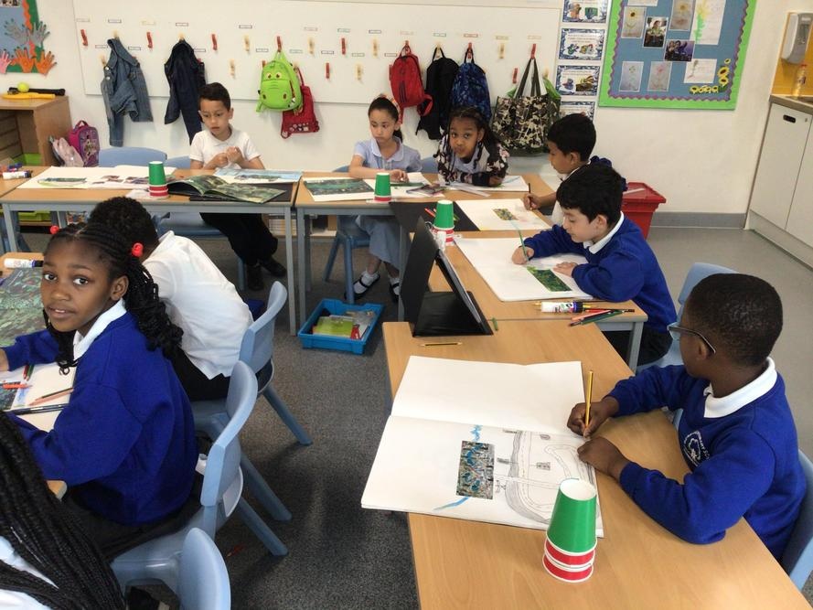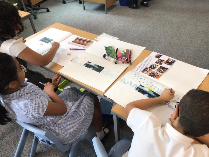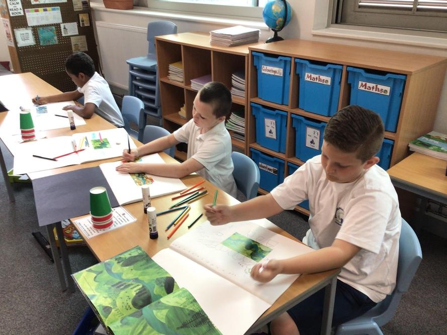 Today, we looked at the immersive illustrations in ‘A River’ and used sketchbooks to create our own artwork. Then in groups, we chose a picture, used our senses and imagination to act out the story captured in it.