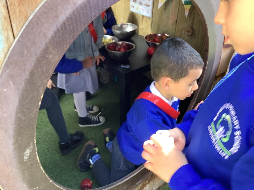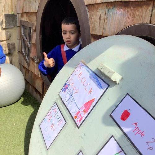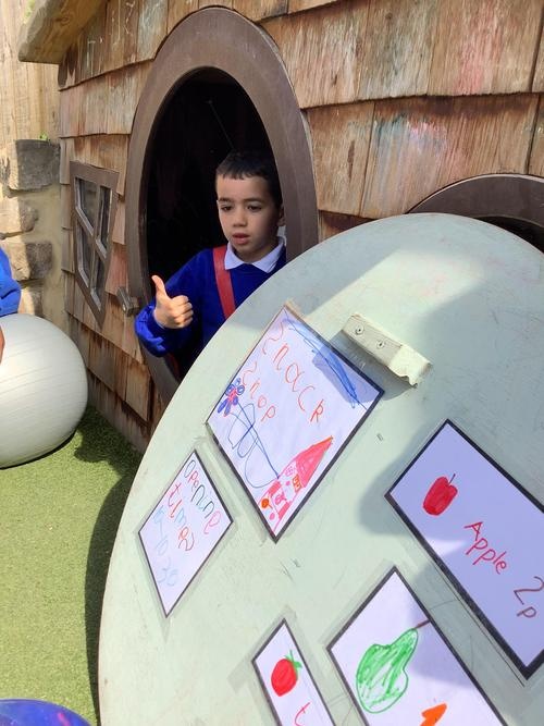 This week the children decided to make their own fruit shop to sell fruit at snack time. They created shop opening times, and price labels themselves. They attached coins to the corresponding numicon pieces for children to pay with. The whole eyes unit got involved in buying and paying for their fruit snack.