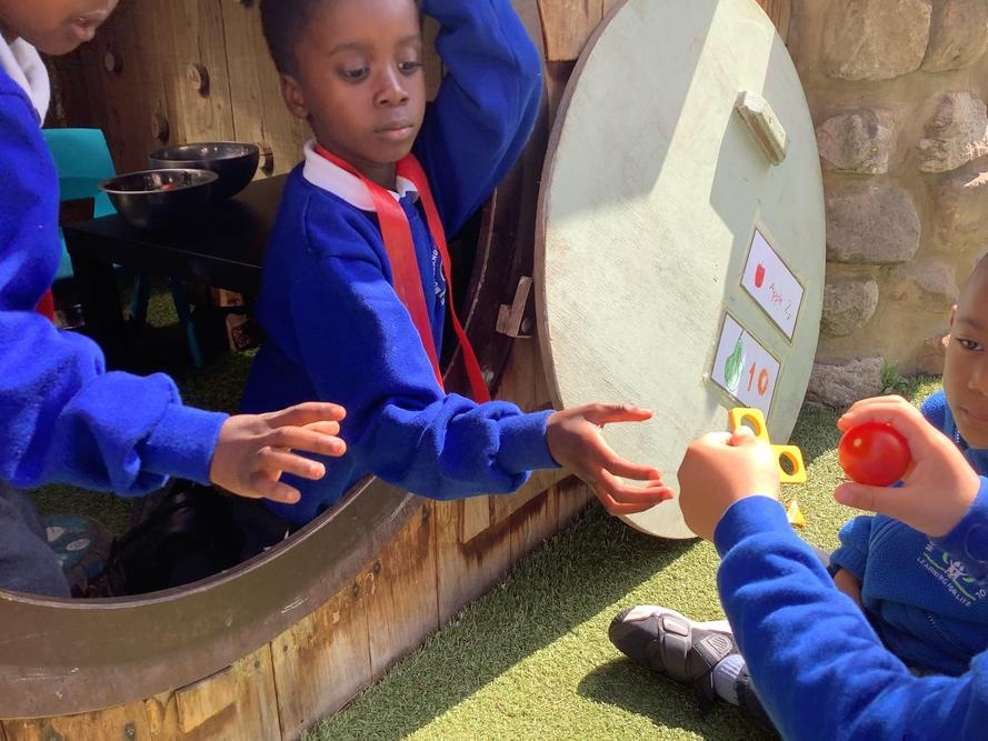Beech class helped out in our fruit shop selling fruit for Numicon pieces.
