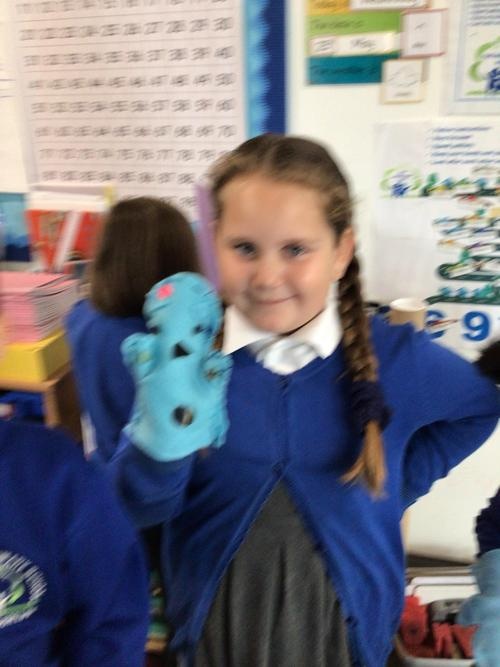 The children practiced sewing around the edge using a running stitch or an over stitch and then added features to their puppet.