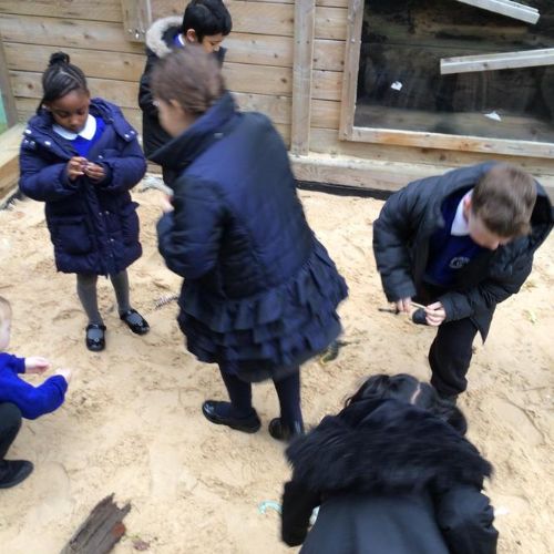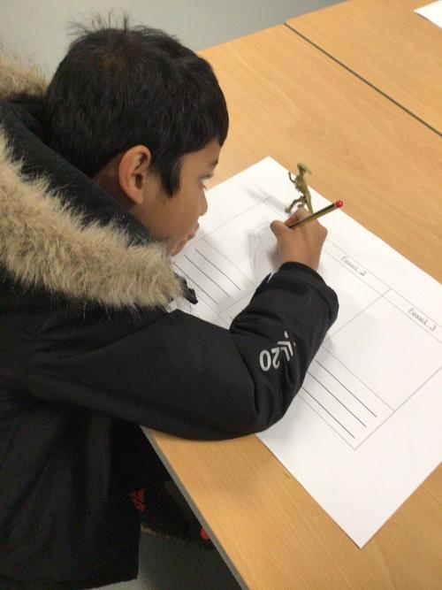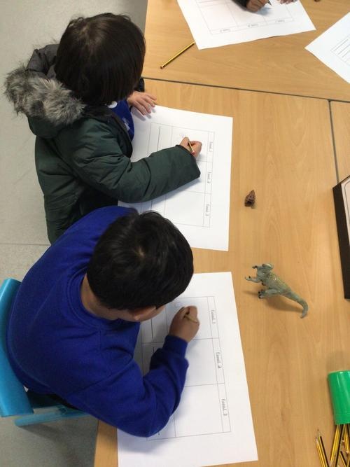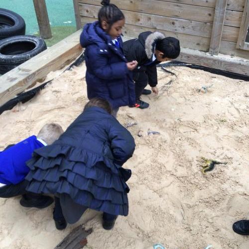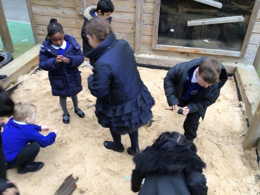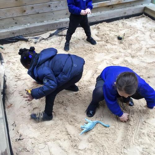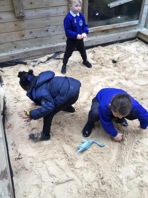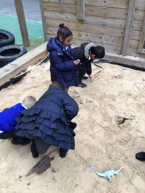 We also had a go at being paleontologists ourselves and carried out a 'Dino Dig' to see what we could find in the sandpit outside - we found fossils, dinosaur skeletons and dinosaur bones!