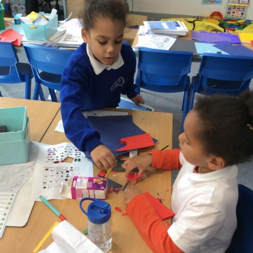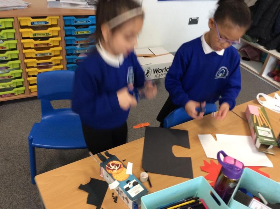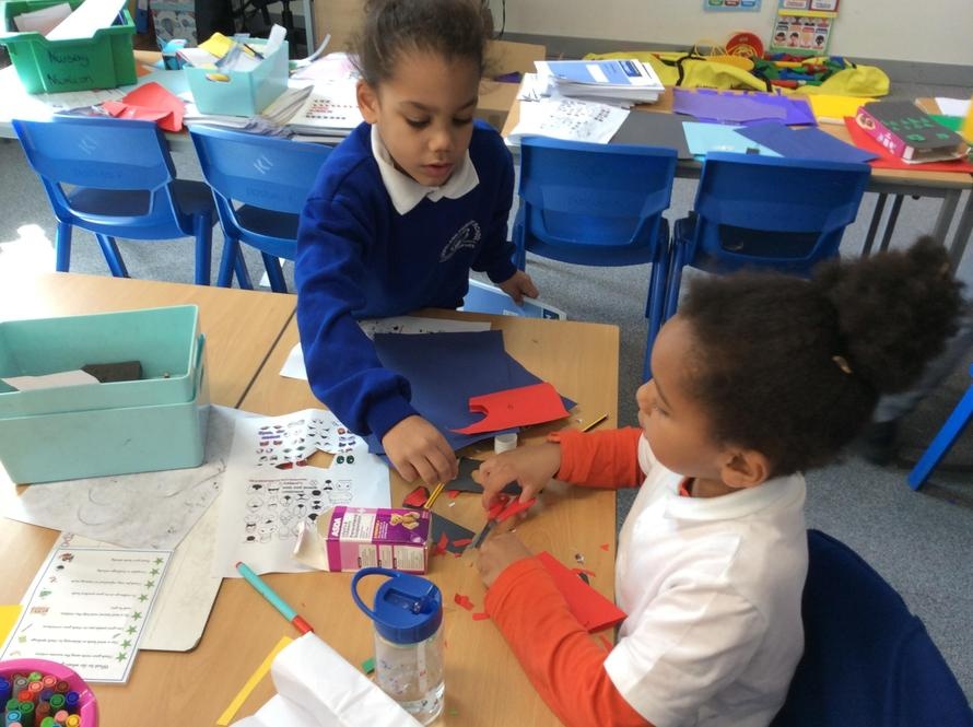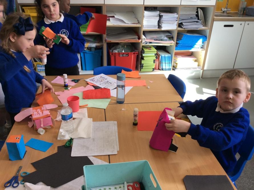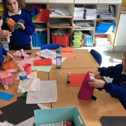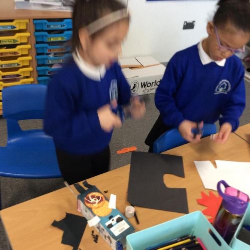 In art we turned cardboard boxes into a moving monster. We used coloured paper to decorate and create features such as tails, spikes, wings and body parts. The children made the mouth move using plastic tubes with a balloon attached and selotape.
