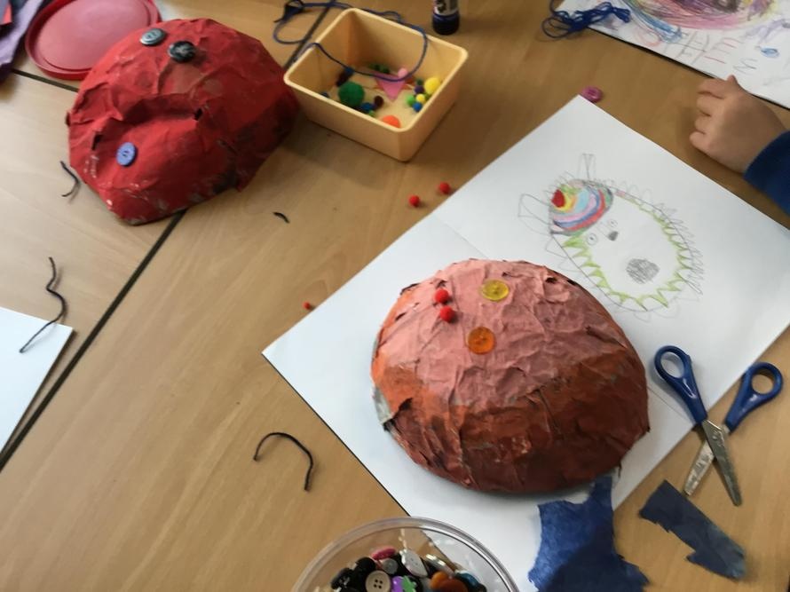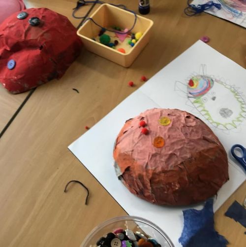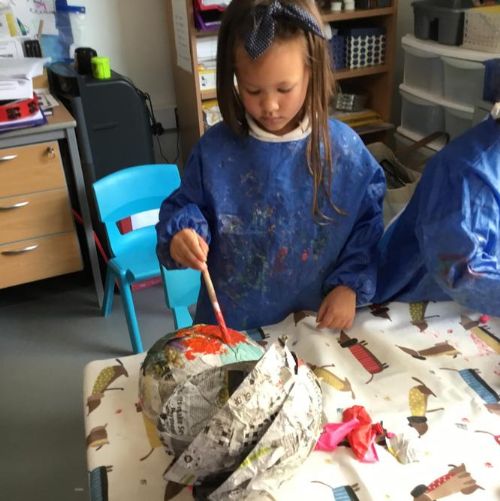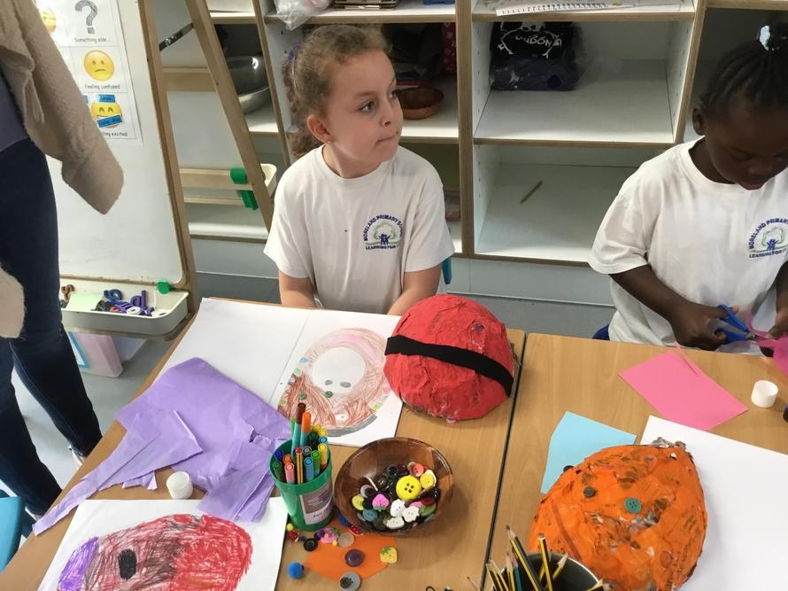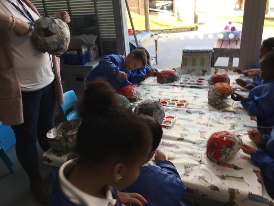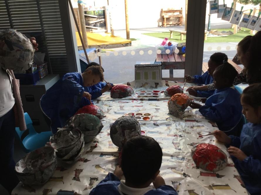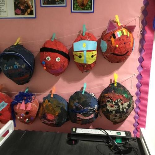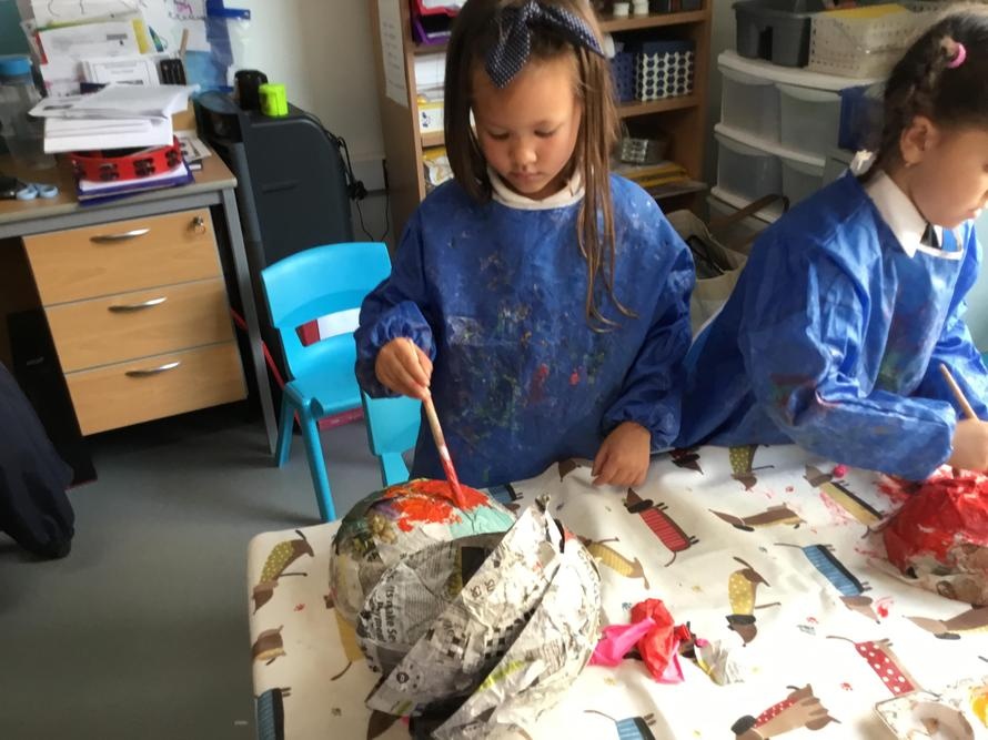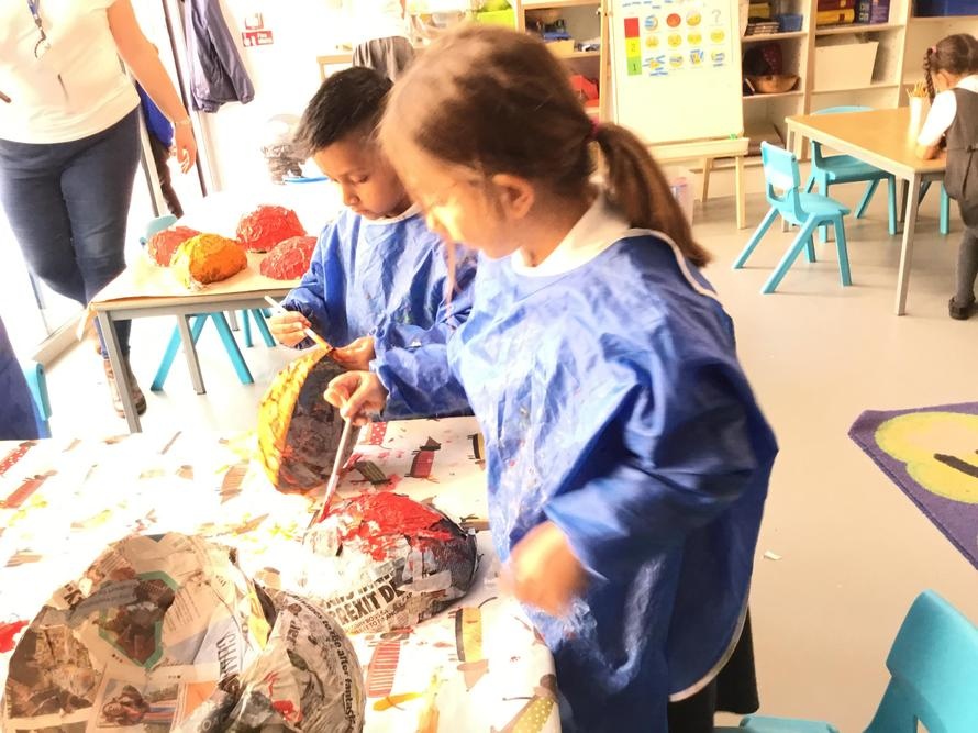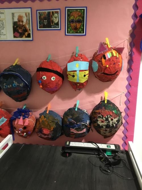 Next came to messy bit of creating the structure for our mask by using a balloon and papier mache. The children loved covering the balloons and then adding the final detail to the masks.