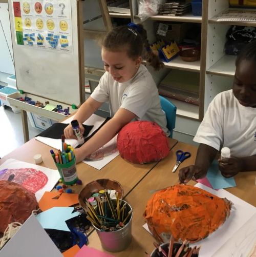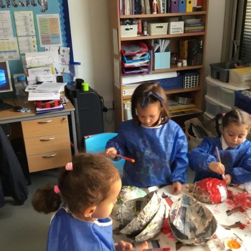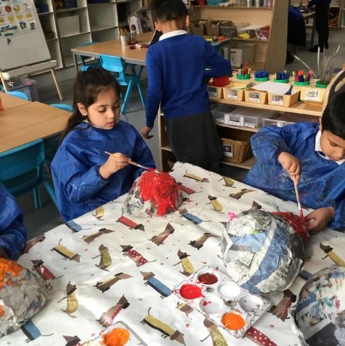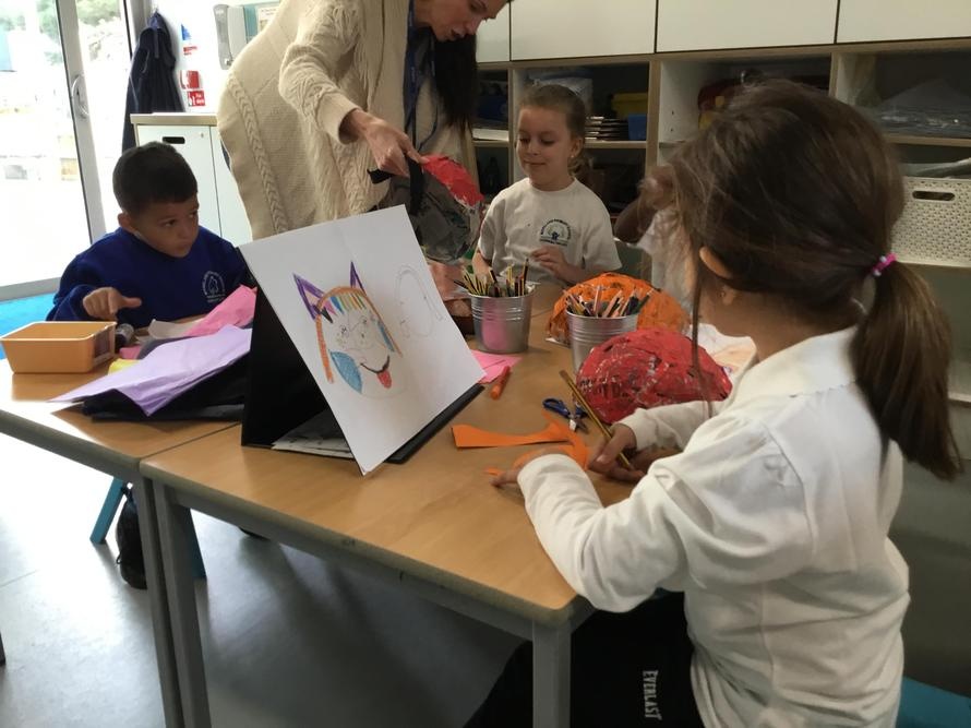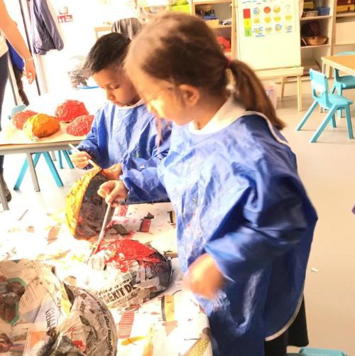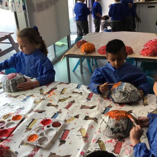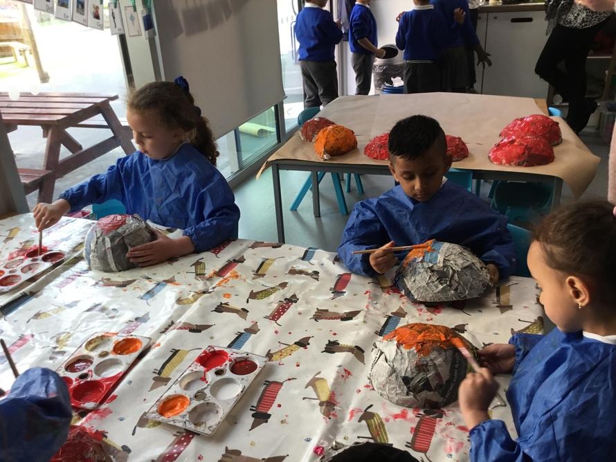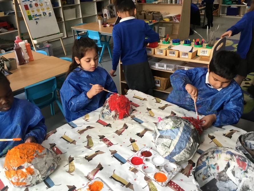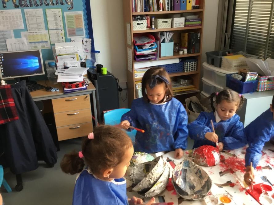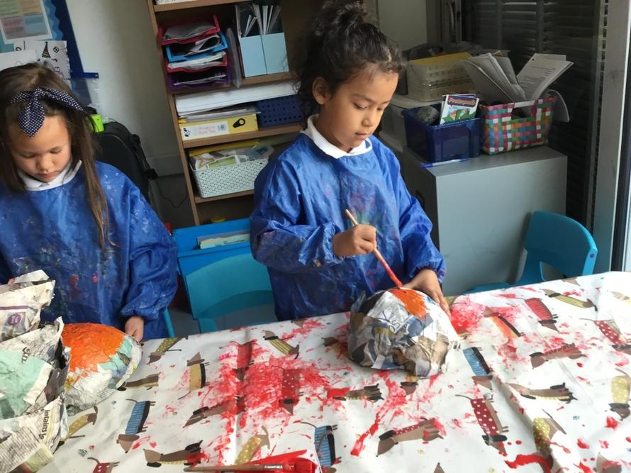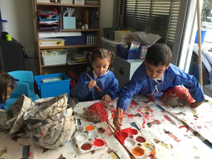 Next came to messy bit of creating the structure for our mask by using a balloon and papier mache. The children loved covering the balloons and then adding the final detail to the masks.